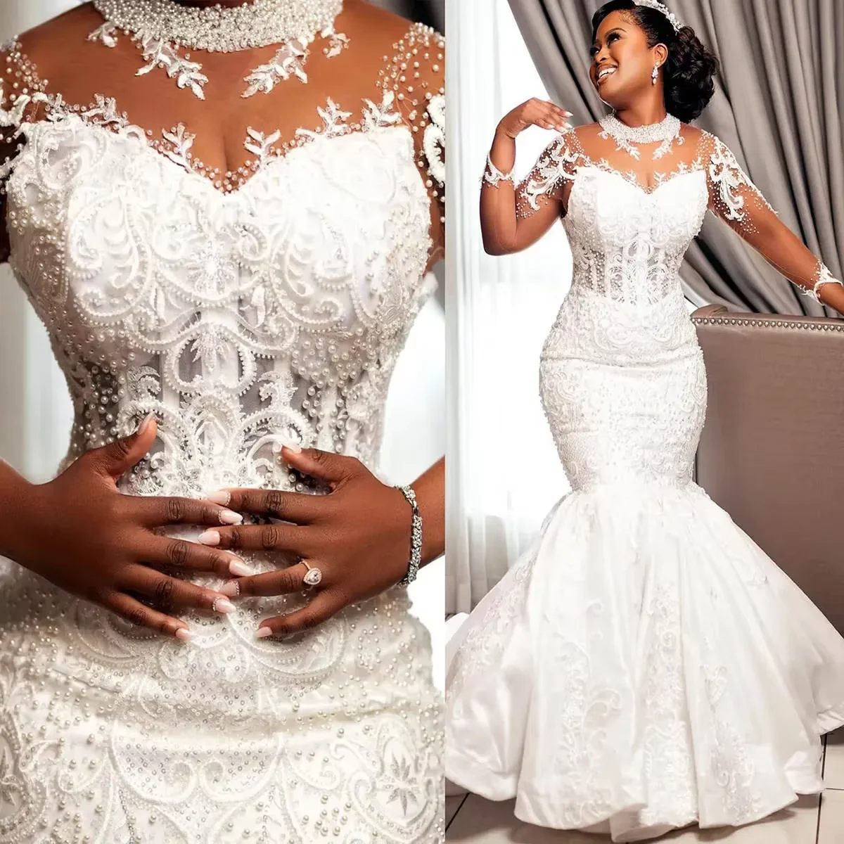 2026 Custom Saudi Sheer O Neck Mermaid Wedding Dresses Beads Pearls Long Sleeve Bride Formal Dress Lace Appliques Bridal